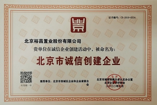 2020年5月,北京裕昌置業(yè)股份有限公司憑借多年來在企業(yè)經(jīng)營過程中堅持的“誠信”理念,經(jīng)過政府機(jī)構(gòu)層層篩選,榮獲“北京市誠信創(chuàng)建企業(yè)”稱號。